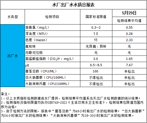 水廠出廠水水質(zhì)日?qǐng)?bào)表(2025-5-29)