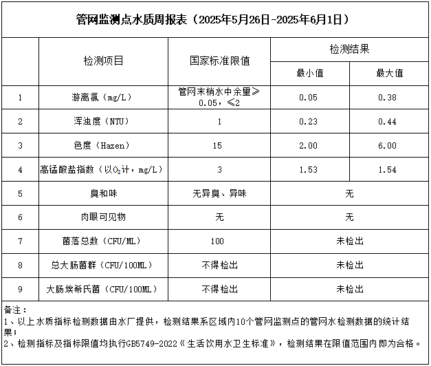 管網(wǎng)監(jiān)測(cè)點(diǎn)水質(zhì)周報(bào)表(2025年5月26日-2025年6月1日)