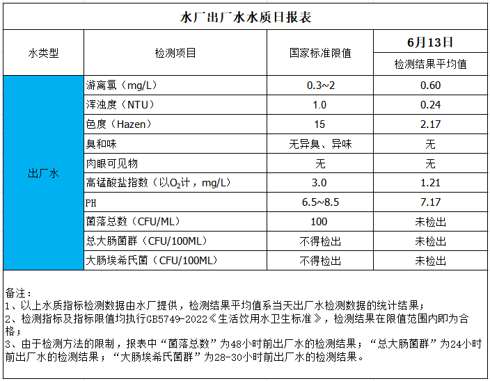 水廠出廠水水質(zhì)日?qǐng)?bào)表(2025-6-13)