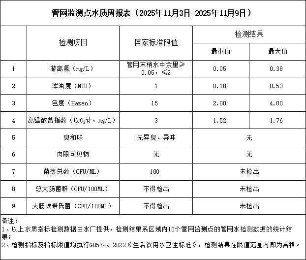 管網監(jiān)測點水質周報表(2025年11月3日-2025年11月9日)