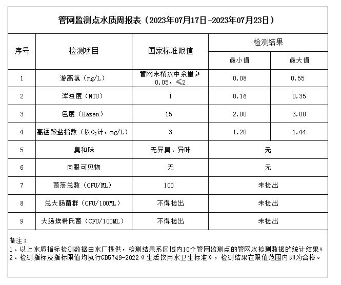 管網(wǎng)監(jiān)測點水質(zhì)周報表(2023年07月17日-2023年07月23日)
