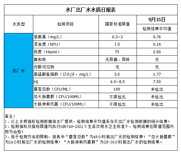水廠出廠水水質(zhì)日?qǐng)?bào)表(2023-9-15)