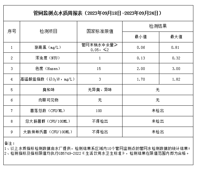 管網(wǎng)監(jiān)測(cè)點(diǎn)水質(zhì)周報(bào)表(2023年09月18日-2023年09月24日)