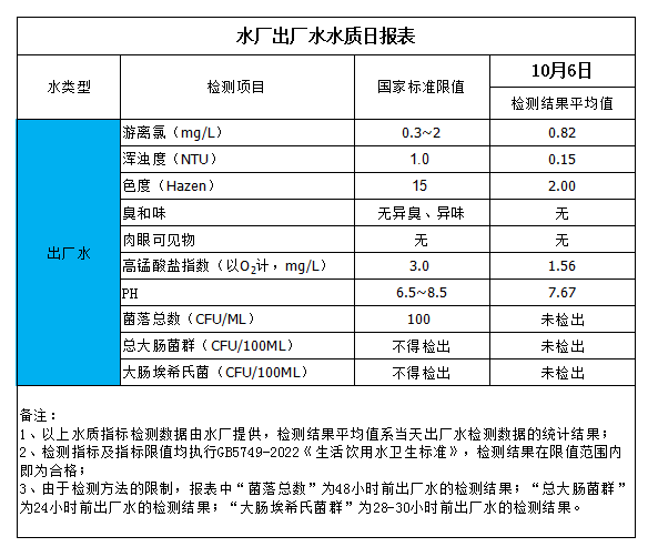 水廠出廠水水質(zhì)日?qǐng)?bào)表(2023-10-6)