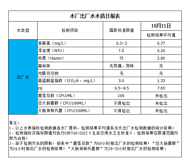水廠出廠水水質(zhì)日?qǐng)?bào)表(2023-10-11)