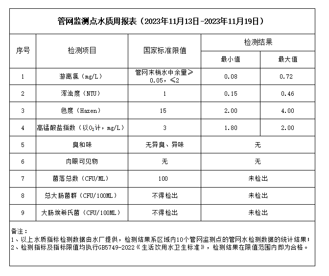 管網(wǎng)監(jiān)測點(diǎn)水質(zhì)周報(bào)表(2023年11月13日-2023年11月19日)