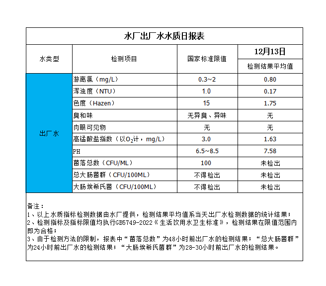水廠出廠水水質(zhì)日報表(2023-12-13)